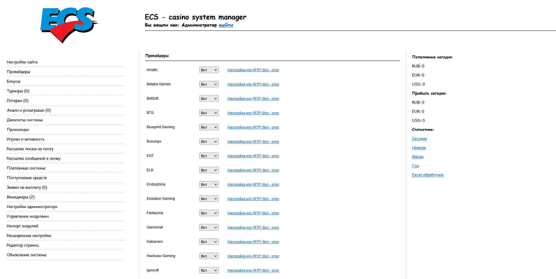 1. Выбор сервера 2. Настройка сервера 3. Установка ядра ECS 4. Настройка ядра ECS 5. Обновление ядра ECS 6. Настройка статистических страниц 7. Настройка провайдеров и слотов 8. Настройка RTP слотов 9. Настройка бонусов 10. Настройка платёжных систем 11. Настройка турниров, лотерей, розыгрышей 12. Настройка модулей 13. Работа с менеджерами 14. Работа с балансами игроков 15. Работа с системой в целом